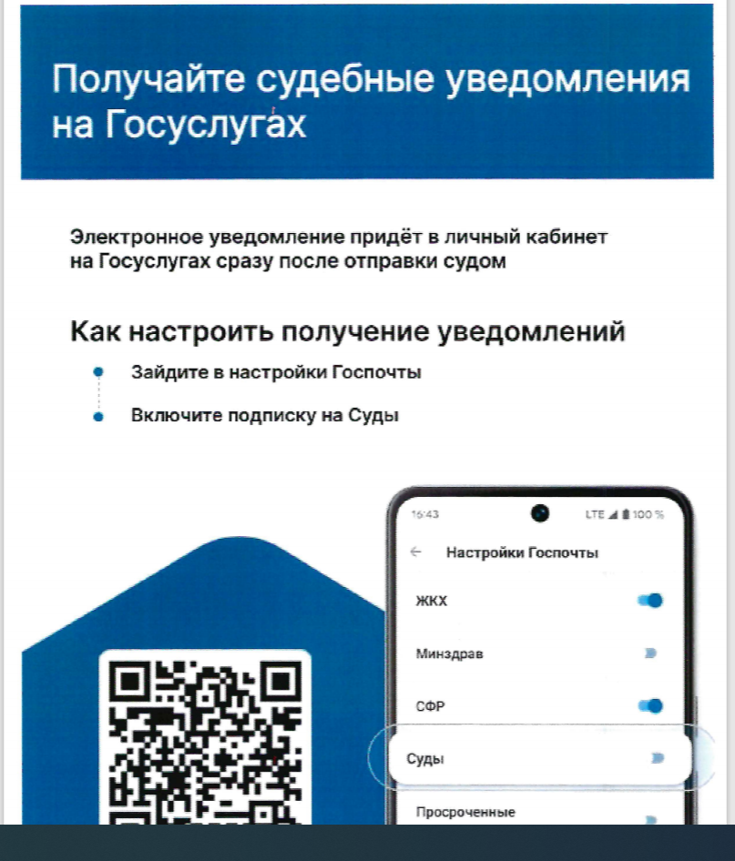 Информируем об использовании QR – кода для перехода на страницу Портала государственных услуг Российской Федерации в части получения гражданами уведомлений в электронном виде. Электронное уведомление приходит в личный кабинет на Госуслугах сразу после отправки судом. Настроить получение уведомлений можно, зайдя в настройки Госпочты и включив подписку на суды.